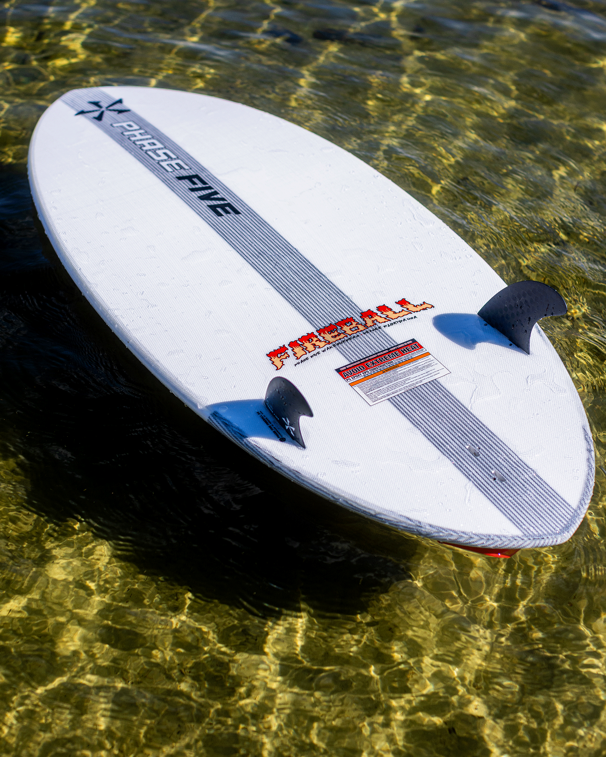 If you can't decide on surf or skim style, why not have both? The Phase Five Fireball Wakesurfer uses the popular skim style Matrix outline and is constructed with our buoyant surf style foam core. When you are in the surf style mood, install the included 4.3 Surf Twin Fin Set at the fin plugs located on the outside rails. Ready for skim style action? Remove the outside Surf Twin Set and install the provided skim style DT Fin in the center position near the tail. Compared to our other surf style boards, the Fireball has reduced volume and rocker to accommodate surf or skim style riding in a single package. The Phase Five Fireball Wakesurfer is glassed with our Flightlite V2™ Pro Select layup for ultimate lightweight performance and is equipped with FCS Fusion plugs for either twin fin surf or single skim fin setup.