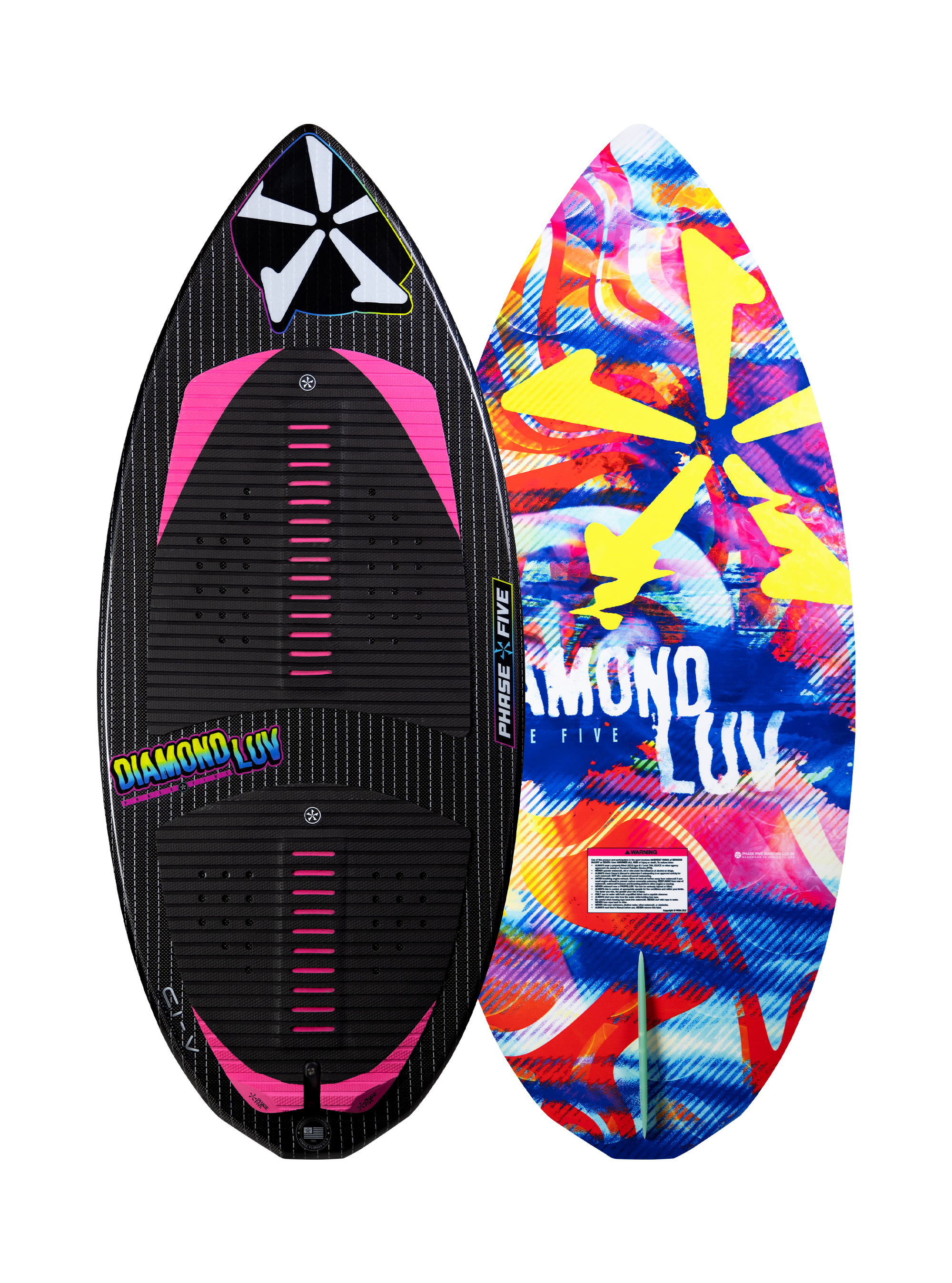 The Phase Five Diamond Luv Wakesurfer is the high-end answer to the ladies pushing their limits. The Luv is the same shape as the Diamond CL in a scaled down version made with the best materials. The diamond shaped tail maintains speed and generates tons of pop for boosting airs. The pulled in nose is forgiving and won't sink under water easily while carving or landing tricks. The Luv is built with our eye-catching CI-V™ (Carbon/Innegra Vertical Weave) material, and a single fin setup loaded with our 1” Skim Fin. This is tough LUV.