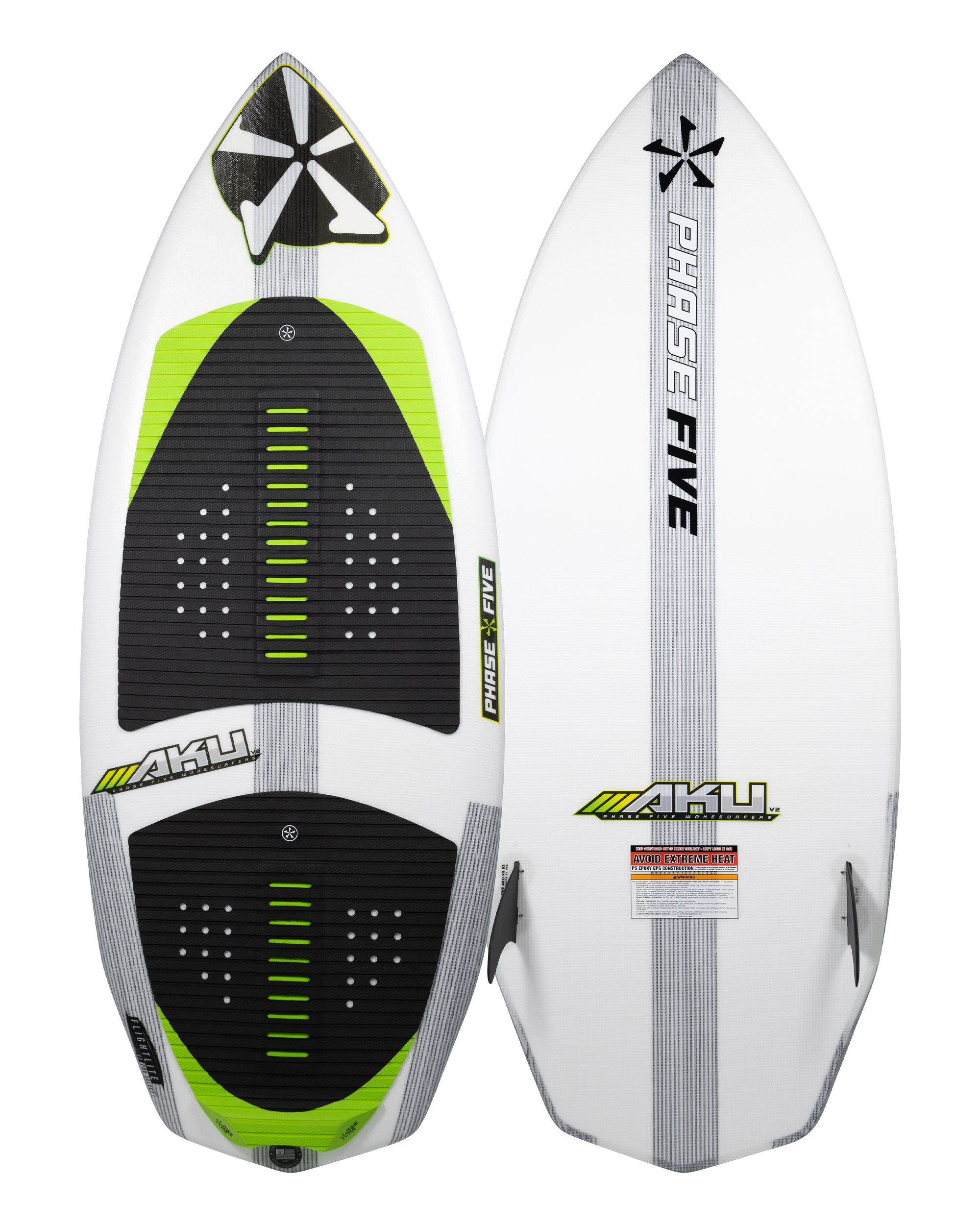 The Aku Wakesurfer was the first surfboard ever introduced by Phase Five. The Aku V2 is a fast, rail to rail, air boosting machine built for speed. The Phase Five Aku V2 Wakesurfer features a diamond bumped wing tail for optimum pivot and pop. It harnesses a nicely pulled in nose that enables aggressive carving on the wave without nose diving. The Aku V2 is glassed with our Flightlite V2™ Pro Select layup for unmatched strength and durability. It is built with a twin FCS Fusion fin setup for an optimal blend of maneuverability and drive.