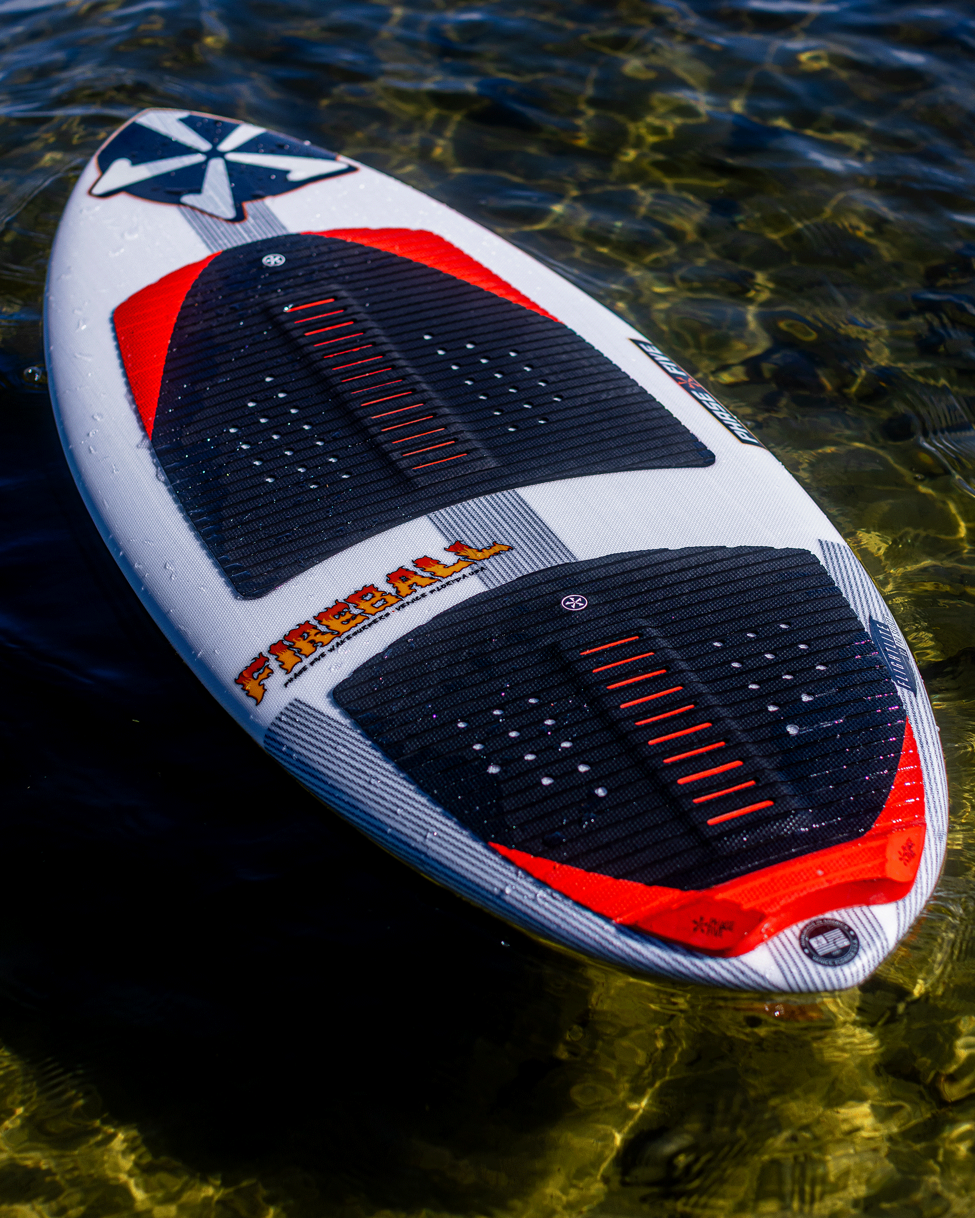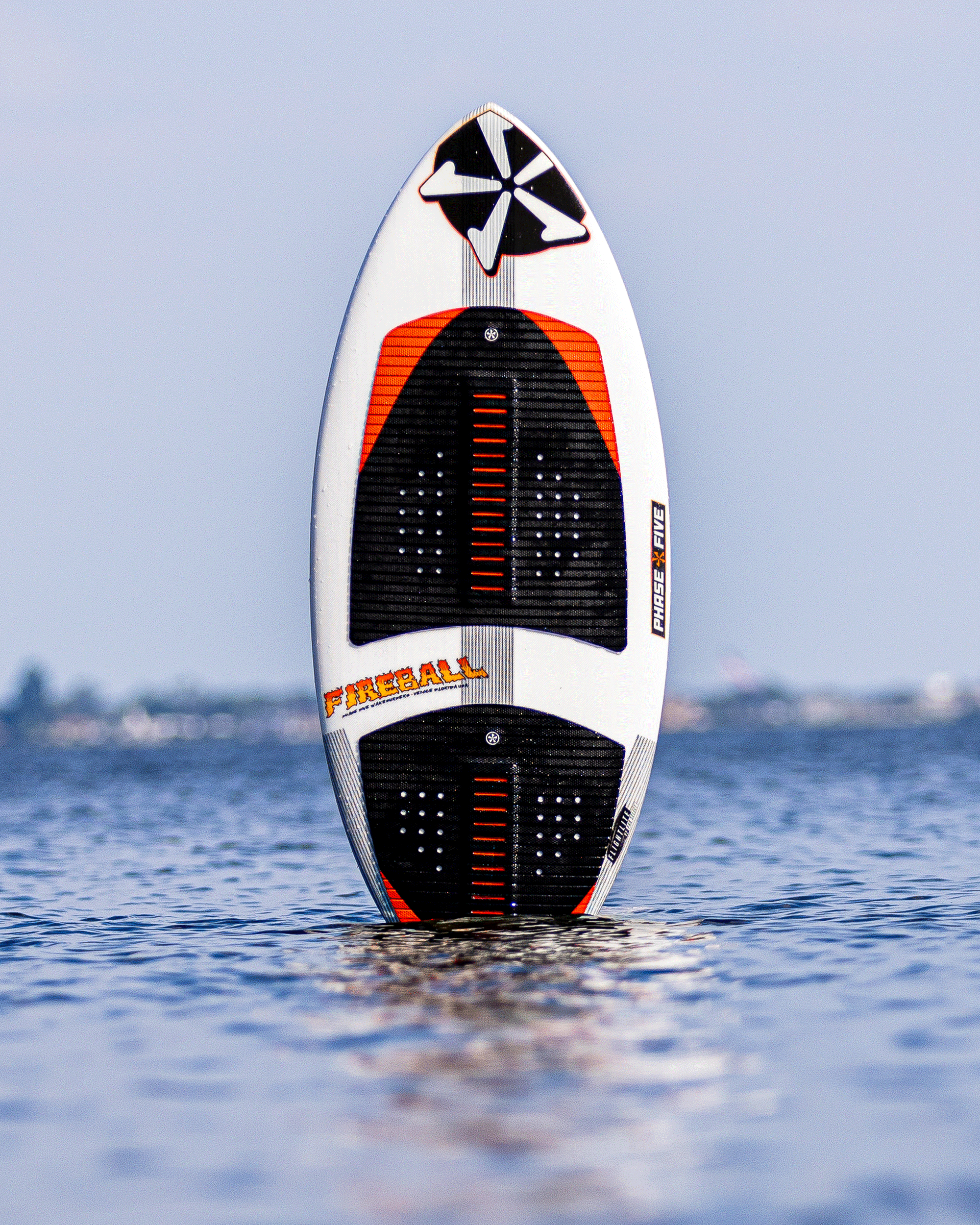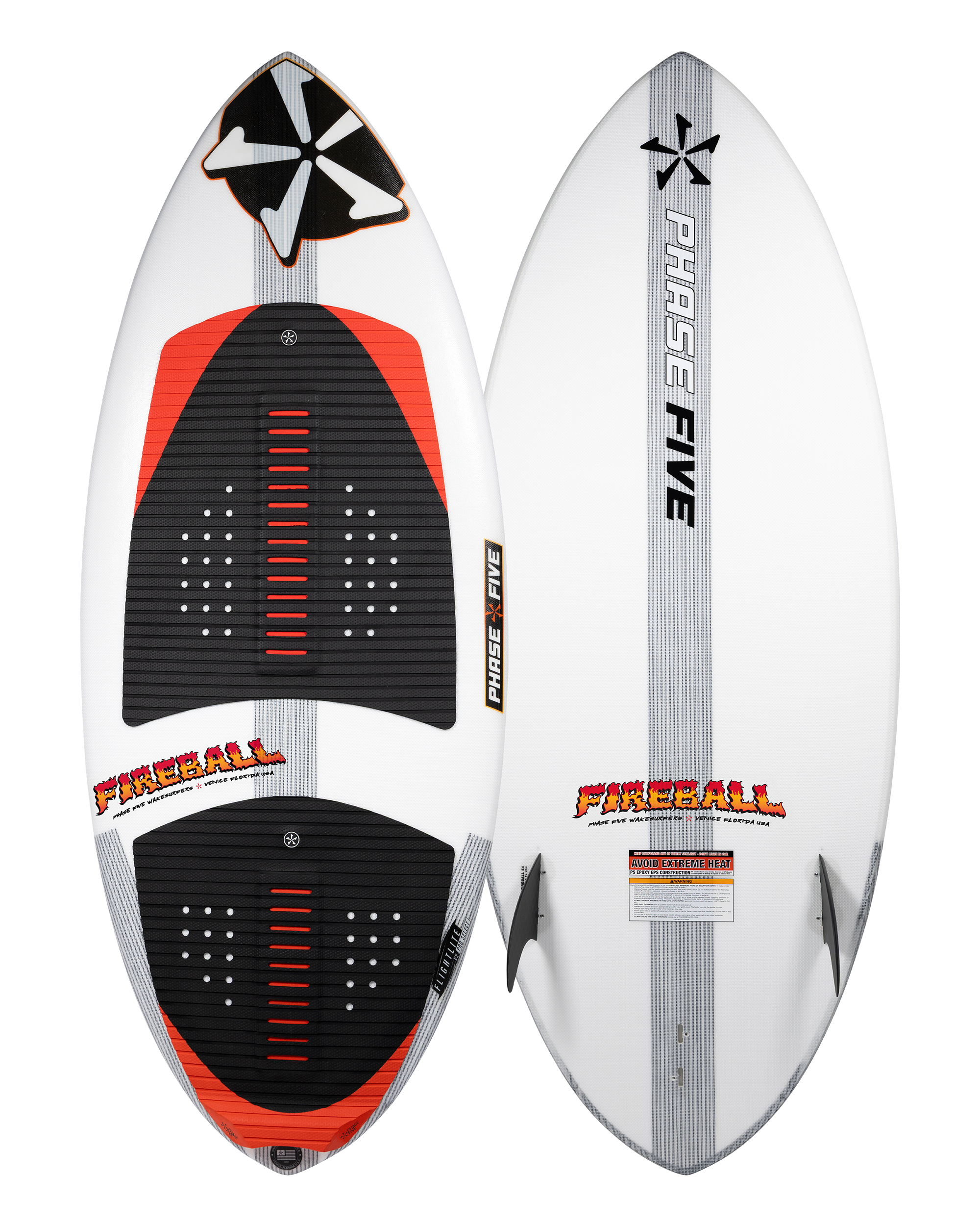 If you can't decide on surf or skim style, why not have both? The Phase Five Fireball Wakesurfer uses the popular skim style Matrix outline and is constructed with our buoyant surf style foam core. When you are in the surf style mood, install the included 4.3 Surf Twin Fin Set at the fin plugs located on the outside rails. Ready for skim style action? Remove the outside Surf Twin Set and install the provided skim style DT Fin in the center position near the tail. Compared to our other surf style boards, the Fireball has reduced volume and rocker to accommodate surf or skim style riding in a single package. The Phase Five Fireball Wakesurfer is glassed with our Flightlite V2™ Pro Select layup for ultimate lightweight performance and is equipped with FCS Fusion plugs for either twin fin surf or single skim fin setup.
