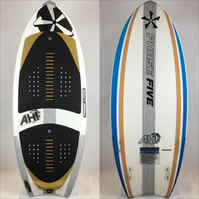 The Phase Five Ahi designed by John Akerman is a complete “ocean” style surfboard that delivers true wakesurf performance. The design features a moon tail shape, wide midsection and a fully rounded pin nose for a perfect blend of handling and performance. The Ahi’s outline delivers more speed and drive down the line while channeling water flow off the tips of its tail for optimal release. The Phase Five Ahi Wakesurfer is glassed with our Flightlite V2™ Pro Select layup for ultimate lightweight performance and is equipped with a quad FCS Fusion fin setup.Flightlite V2 Pro Select is our surf style construction for ultimate performance. It is now our lightest build with a 20% weight reduction. This is a PERFORMANCE build designed to get the most out of the surf shape and provide riders with ultimate “feel”. The layup schedule features a full Innegra bottom sheet with a carbon stringer along with a full Innegra top sheet with carbon tape reinforcing the tail.