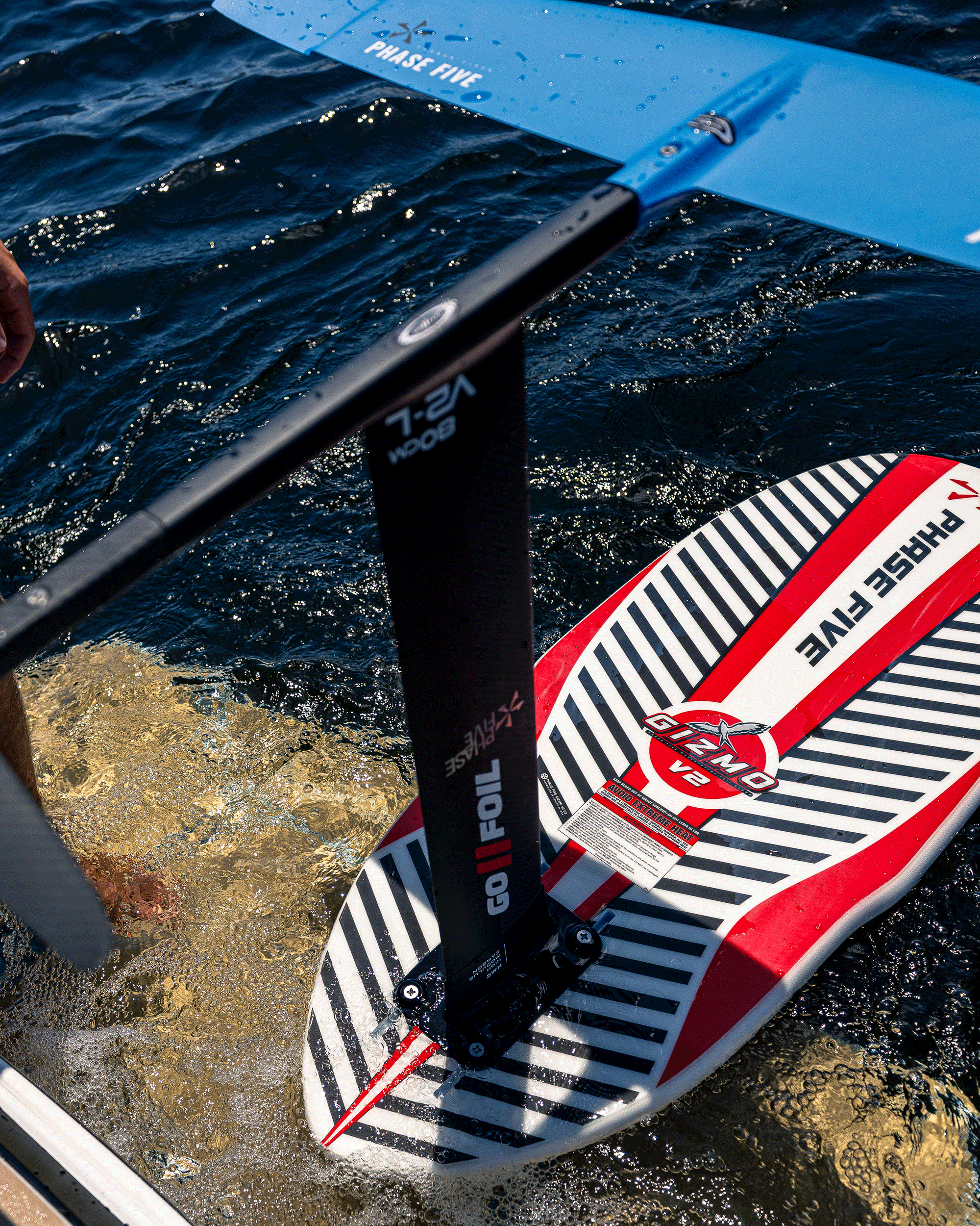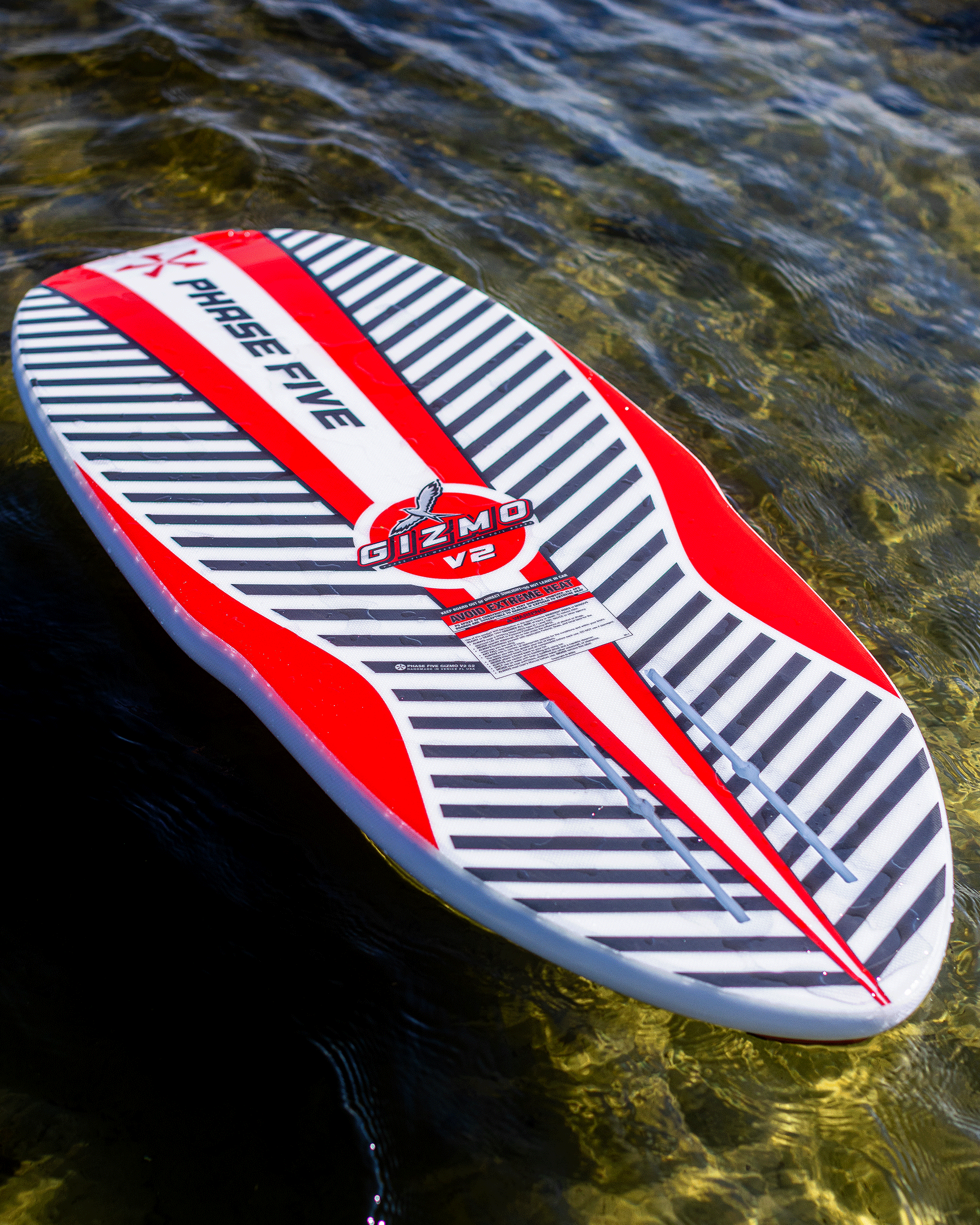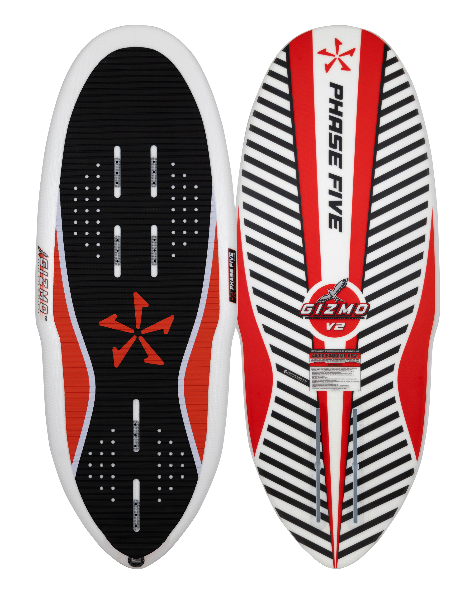The Gizmo V2 is a modified pin-tail version of our original foil board. It is ultra light, super stiff and delivers the right amount of float. We designed the Gizmo V2 with an extra wide rounded nose to help recover during a foil breach and pulled in the bottom half for superior handling. The Gizmo V2 separates itself by the pin-tail which gives the board increased sensitivity with the foil. It is built in smaller sizes to further this concept of being a high performance machine recommended for the well-versed foil riders. The Gizmo V2 comes equipped with foot straps for huge airs and strapped in foil maneuvers. This tough foil board is glassed with our high end FLEXtec V2™ system for unmatched strength and durability. The Phase Five Gizmo V2 utilizes an adjustable 10.75” long reinforced track mount system for the foil.